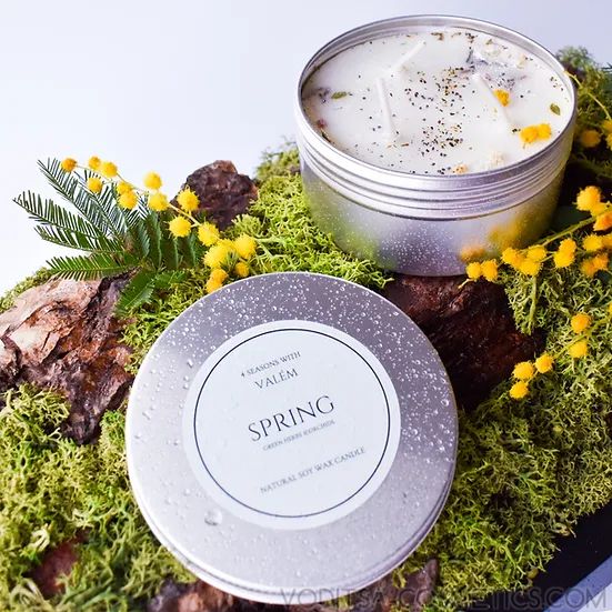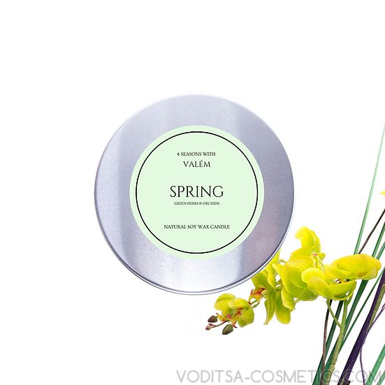 С натуралната свещ SPRING от колекцията 4 SEASONS WITH VALÉM ще се насладите на три пламтящи памучни фитила, които рзпръскват ухание на горски билки и цветя.